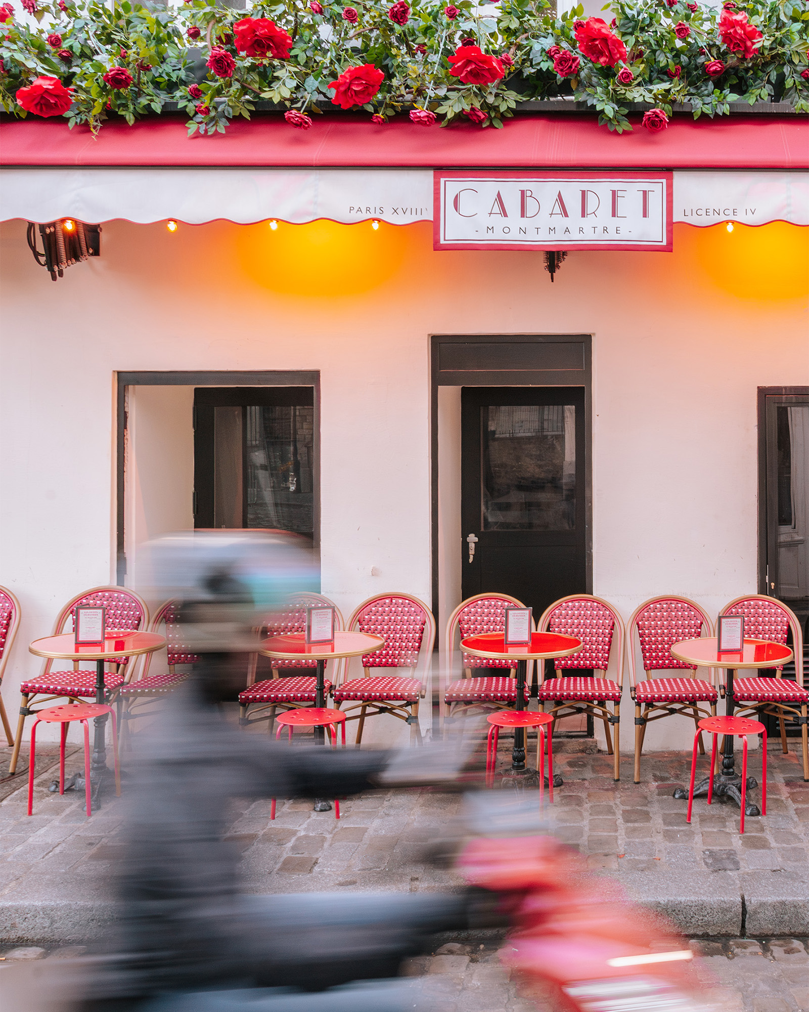 A scooter rider whizzes along one of Montmartre's narrow cobblestone streets.